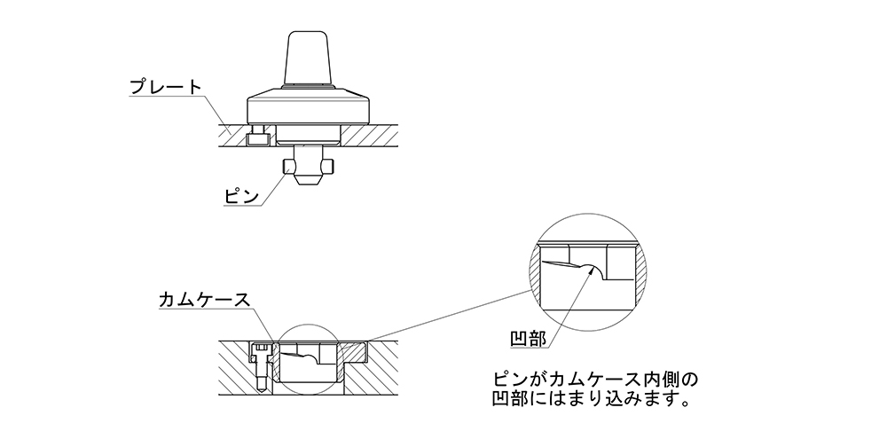 オフセット荷重(モーメント荷重)がかかる使用についてクランプ時は、クランパーのピンがカムケース内側の凹部にはまり込むため、振動によりクランプが解除されることなくご使用いただけます。