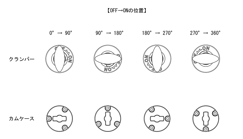 クランパーのON/OFFの位置は、クランパーとカムケースを取付けた方向で決まります。