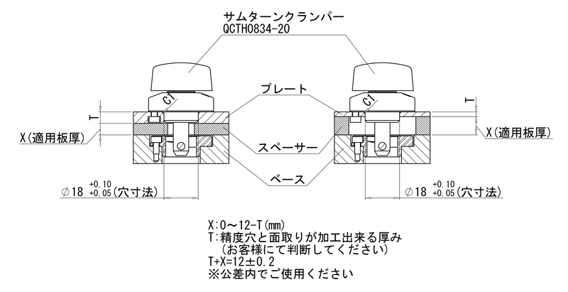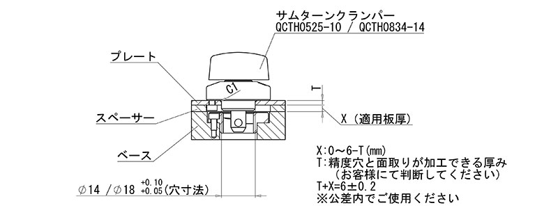 ただし、板ワークを挟み込むことによって、クランパー取付けプレートが薄くなりますので、T寸法は精度穴と面取り加工ができる厚みにてご使用いただくことをお奨めします。